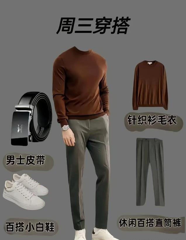 上衣:棕色针织衫毛衣,温暖而沉稳,适合周三这个略显疲惫的工作日。